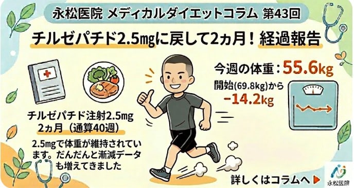 チルゼバチド注射2.5㎎にして2ヵ月、漸減したデータも増えてきました 副院長メディカルダイエット チルゼパチド2.5㎎₋2₋8週(通算40週目)㊸